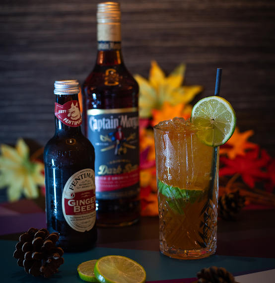 A highball cocktail made with dark rum, ginger